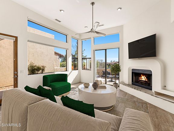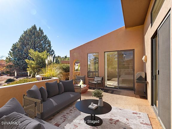 Contemporary architecturally timeless chic and modernized 2-bedroom ensuite townhome in the West Sedona corridor awaits at 25 Santa Susana! At the perfect size of 1887 square feet, in the perfect location, tucked away from the traffic of Dry Creek Road, with perfect Red Rock views from the front bedroom ensuite, this is perfect home away from home or your full-time home! Boasting soaring ceilings, niches, skylights, and windows galore, this open concept floorplan has wonderful upgrades. From it's completely redesigned kitchen with butcher sink, chiseled quartz counters, split colored cabinetry, to sharp tile flooring, modern nickel ceiling fans to its ultra cool powder room with tiger veined floating cabinet and colored backsplash this one is a keeper! Living room and primary bedroom open onto a huge patio which is convenient to the association's private pool and hot tub. After a long hike, open your personal gate and meander along your stone pathway for a cool dip and come back home! How convenient! Dining Room Area is large and is a wonderful place for gatherings or playing cards! Cozy up to the Corner Fireplace in the Living Room. Primary Bedroom boast dual sinks, a garden tub, separate shower and walk in closet. Large guest bedroom ensuite offers a ½ moon center window with red rock views. Center Study opens onto an atrium for your potted plants. Updated laundry room with mud sink and 2 car garage complete the single level living. Other upgrades and improvements include new AC unit, water softener, overhaul of RO system, front door, all new door handles, blinds, and bedroom shutters. Owner has even added a gas line to the back patio for your grill! Listing photos have been virtually staged to give you an idea of the possibilities! Monthly HOA dues maintaining the exterior building and exterior lawn and landscaping, common gardens and park, roof, awnings, gutters, downspouts, water, AND garbage collection! What a turnkey operation! Wow Wee! All you need to do is relax, unwind, and rejuvenate. Across the street is extra guest parking, and close to shops, eateries, sidewalks, and bike paths what are you waiting for? So, follow your bliss and make 25 Santa Susana your happy place!