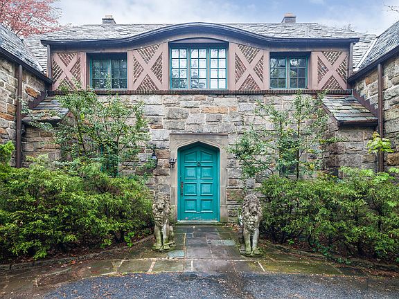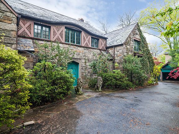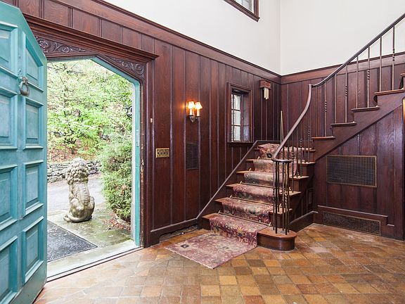 Wonderfully impressive, this incredible Bavarian estate enjoys a secluded setting surrounded by evergreens and shaded trees. Resting on over a half acre in Staten Island’s prestigious Emerson Hill, this home offers a rare combination of natural beauty and the convenience of city life. Inside, a stunning interior features original German architecture and tremendous space for entertaining. A dazzling two-story foyer makes a fine introduction with an elegant turned staircase and rich mahogany decor. With a rustic fireplace and spectacular views, the ballroom-size living room is a delight in every season. The dining room, equally charming, easily seats a houseful of guests. A crackling fireplace and walls wrapped in rich wood paneling and built-ins give the library a distinctive feel. With two first floor porches, you have space for reading and socializing. An eat-in kitchen is ready for cooking and baking, and a butler's pantry stores the essentials. Five palatial bedrooms are on the second floor. Fit for a king, the master suite has a sitting room, nursery, and second-floor property views. Four additional bedrooms enjoy large closets and plenty of space. On the lower level, a full, finished basement adapts easily to your needs. With its versatile layout, you are free to use this space as you wish. THE INTERIOR Three finished levels includes a main level with large entertaining rooms and an easy flow, five bedrooms on the second floor, and a full, finished basement Wood and tile flooring, picture windows, high ceilings, original casement, teak and mahogany 2 fireplaces with marble and limestone Eat-in kitchen with a butler's pantry Convenient powder room on the first floor Full master suite THE EXTERIOR Stone and wood exterior Paved driveway with additional parking Detached garage Professionally landscaped property Desirable Emerson Hill location close to shopping, recreation, parks, schools, and NYC commuter trains Easy access to major highways, business centers and airports Call Laird Klein Realty Direct 718-980-6700