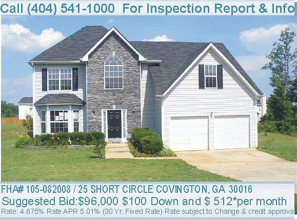 25 SHORT CIRCLE, is located in COVINGTON, GA 30016. It is currently listed for $83000.00. For more information, contact us at expert@hudlisted.com or call our Distressed Property Hot-line at (888) 576-0062.<br /> <br /> 25 SHORT CIRCLE is a single family home and was built in 2001. It has 4 bedrooms and 2.50 baths. 25 SHORT CIRCLE was listed on 02/04/2011. <br /> <br /> 25 SHORT CIRCLE, COVINGTON, GA 30016 is a HUD owned Home. For a copy of the Property Condition Report on 25 SHORT CIRCLE, COVINGTON, GA 30016 or to speak to a Distresded Property Agent, contact us at expert@hudlisted.com or call our Distressed Property Hot-line at (888) 576-0062. HUDListed partners with HUD Registered Distressed Property Experienced agents to help Home Shoppers with the "HUD Owned" Home Buying Process.<br /> <br /> HUD Listed is not the listing broker for this HUD Owned Property. ALL PROPERTIES ARE SOLD IN "AS IS" CONDITION. SELLER MAKES NO REPRESENTATIONS OR WARRANTIES CONCERNING THE CONDITION OF THE PROPERTY AND DOES NOT GUARANTEE THAT THE PROPERTY IS FREE OF HIDDEN OR VISIBLE DEFECTS. BUYER IS RESPONSIBLE TO TAKE ACTION TO SATISFY HIMSELF THAT THE PROPERTY IS IN A CONDITION ACCEPTABLE TO HIM. SELLER WILL MAKE NO REPAIRS. BUYER IS ENCOURAGED TO HAVE A HOME INSPECTION TO IDENTIFY ANY DEFECTS.