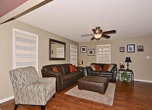 Welcome to this tastefully updated 2 story w/4beds, 3.5 baths, WALKOUT Lower Level & HUGE fenced-in backyard. Beautiful dark wood look flooring welcomes you into the living room w/extra windows letting in natural light and leading into the breakfast room w/bar & kitchen. The kitchen features raised panel cabinets w/crown molding, gas range, colorful back splash & added pantry cabinet. 3 season room just off the breakfast room offers another great main floor area which leads to the deck, aggregate patio & pool! Upstairs has convenient laundry room. The vaulted master suite has a private bath w/separate tub & shower. 3 other bedrooms are ample size w/2 rooms featuring walk-in closets. The L-shaped finished lower level has full bath and walkout to covered aggregate patio. This home sites on one of the largest lots in ALL of Stone Meadows, and backs to Timberland practice fields. Subdivision features walk trails, pool and great access to Hwys 40 & 70. Plus, convenient location to school.