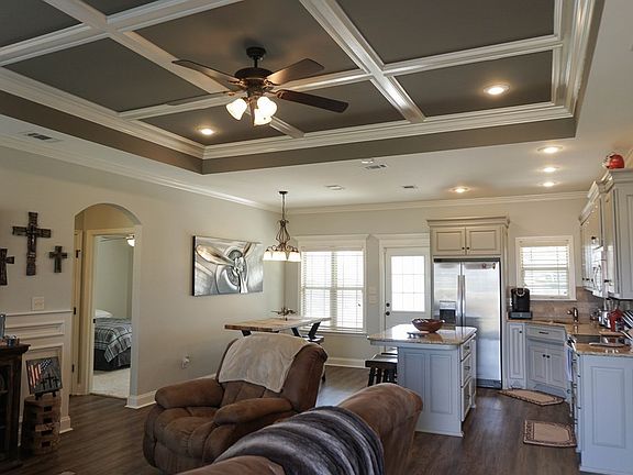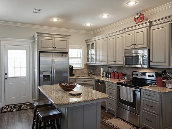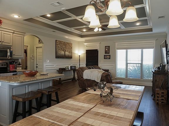 Impressive style: flooring, woodworking and accents are modern and clean. Tray ceilings with crown molding, coffers, judges panels, recessed lights, all granite countertops. Open concept Living Room/Kitchen/Dining. Kitchen features granite island, SS refrigerator, drawers have built-in dividers. Plenty of space in the Master Bedroom and Bath, includes separate tub and shower with rain shower head, large walk-in closet. House now has gutters, updated shrubbery, lime tree at corner of house. Half acre lot, huge fenced back yard. Rear: XL covered porch plus open slab for BBQ! Irrigation and alarm system, termite bonded. Enjoy the new neighborhood pool! Minutes from MAFB. VA & USDA eligible. Cozy yet ready for company, well maintained, clean as a whistle, full of good memories and ready to create more with you!