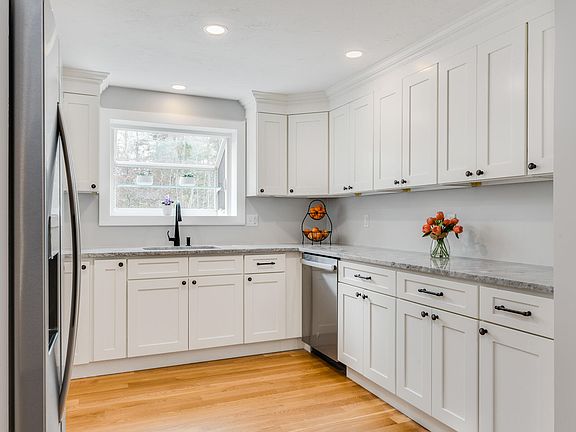 Welcome to your dream home in the coveted Southpoint Condominium complex! This recently renovated two-bedroom townhouse offers the epitome of modern living and timeless elegance.Step inside to discover a stunning main floor adorned with brand new white cabinets, sleek granite countertops, and top-of-the-line stainless steel appliances, creating a chef's paradise. The rich wood floors gracefully flow throughout, exuding warmth and sophistication.Cozy up by the wood burning fireplace on chilly evenings, or entertain guests in the spacious living area. A convenient half bath with an updated vanity completes the main floor.Venture upstairs to find two oversized bedrooms, providing ample space for rest and relaxation. A full bathroom ensures comfort and convenience for all occupants. Added luxuries include central air conditioning for year-round comfort, while the full unfinished basement offers endless possibilities, featuring washer/dryer hookups and a large cedar closet. Outside, indulge in the association pool or take a tranquil stroll along the path to Triangle Pond, immersing yourself in nature's beauty. With newer roof, windows, and slider, this turnkey townhouse offers ease of living.