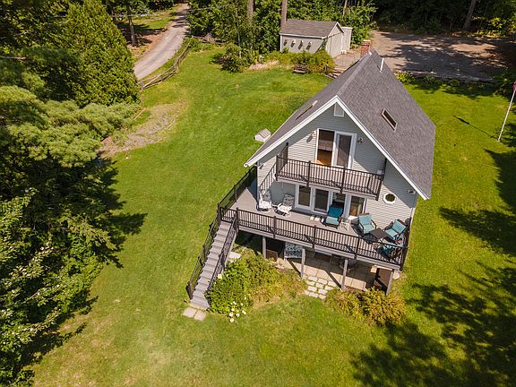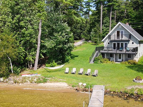 There's plenty of room for lots of company with 4 bedrooms, 2 full baths and the cutest bunkhouse. There are even 3 electrical hookups for RV's. The upper level is where you will find the primary suite. Wake up with views of this 8,500 acre lake right from your bed. Enjoy morning coffee on your deck. There's also a huge walk in closet and your own private bathroom. The lower level consists of 3 more bedrooms. The main level allows views of the lake regardless of whether you're in the kitchen, relaxing in the living room or sitting out on the deck. The dock has plenty of room to tie up several boats. Fish from the dock or take a ride on the largest lake in the Central Maine area. Why not take a boat ride to Sadie's Boat House or the Village Inn for dining? An existing outbuilding near the driveway could be converted into a garage. We invite you to come for a visit - you won't want to leave. All furnishings included with an acceptable offer. All of this could be yours!
