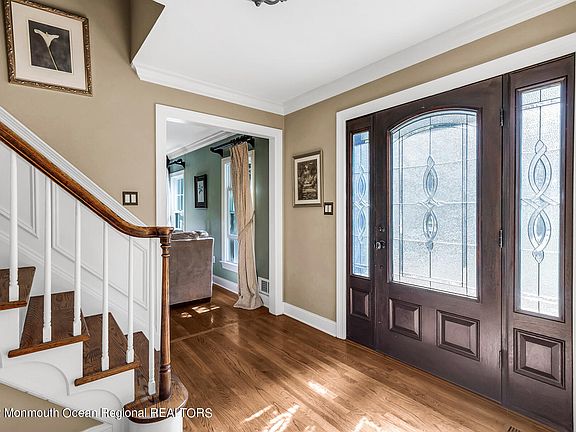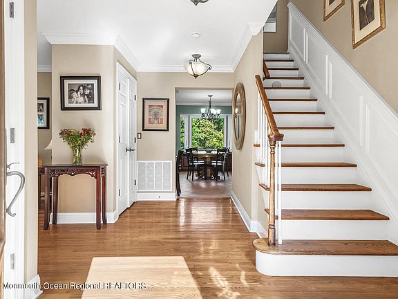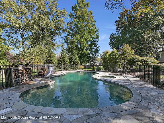 This timeless 5 bed, 4 bath custom colonial is a true Colts Neck treasure & is in the highly sought-after Clover Hill section. Home offers decorative moldings, vaulted ceilings, wood floors & appealing interior design. Spectacular great room is complete with a wall of rich wood cabinetry, elegant dining room offers wainscoting & beautiful sunroom showcases an eye-catching wall of windows & wet bar. The gourmet eat-in kitchen features custom wood cabinetry, charming window seat & center island. Fabulous primary bedroom has 2 large walk-in closets & luxurious primary bath includes a whirlpool tub & double sinks. Sensational full finished basement has multiple entertaining areas, built-in shelving, cedar closet & additional closets for storage. Take the fun outdoors in your very own private backyard resort. Breath-taking views, glistening heated Gunite pool, spa, fire pit & expansive bluestone patio & deck is sure to impress the most discriminating buyer. The home also offers 2 car garage, mud room with custom cabinetry, bedrooms that are bright & spacious. Living in Colts Neck offers proximity to gorgeous beaches, horse farms, parks & NYC transportation.