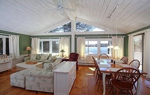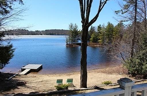 Get ready for prime lakefront living! This beautiful waterfront home is set on the eastern side of tranquil Sunset Lake, affording breathtaking western sunsets across a placid cove year round. The home's upper level features a large open concept kitchen/dining/living space with grand wood fireplace, gorgeous wide plank floors, and impressive vaulted ceiling. Upper level also includes an office/bedroom and half bath. The lower level of the home includes two bedrooms with lake views (one of which accesses an exterior patio, just steps from the water), a full bath, and a bonus room (or additional bedroom). Large wrap around deck affords many more opportunities to enjoy this lovely home and its wonderful surroundings. Set on a spacious 0.47 acre parcel and boasting level, sandy PRIVATE beach, this wonderful home is just 65 miles from Boston but feels like a world away.