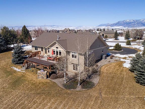 Enjoy the views from every room in this home. Southern exposure offers lots of light with 180 degree views of the Gallatin Mountains and Spanish Peaks. North side offers views of the Bridger Mountains. The spacious kitchen features stainless steel appliances with a gas range, granite countertops, a pantry and dining area with a gas see-through fireplace to the living room. Main floor master is spacious with hers and his walk-in closets, separate sinks, soaking tub and walk in tiled shower. There are two additional bedrooms on the main floor with a full bath. The walkout basement has two additional bedrooms, exercise room, large living area and a spa like bathroom. This home has lots of storage including a 3 car garage. There are two great outdoor living areas, perfect for entertaining. One features shade with a barbecue area and a wood burning fireplace. The upper deck has room for outdoor dining and seating. New paint and carpet on the main floor.