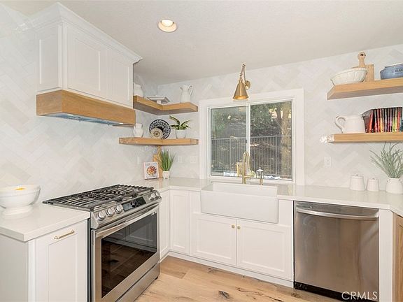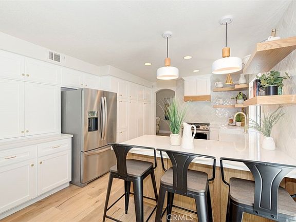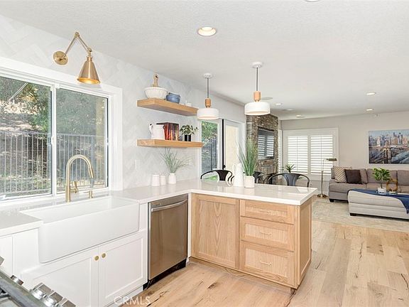 Nestled within the serene landscapes of the trophy community of Wagon Wheel, this single-family haven embodies luxury and tranquility. Step into a realm of timeless elegance where every detail has been meticulously crafted to create an atmosphere of refined living. As you enter, be greeted by the allure of Provenza Old World Fossil Stone Engineered Wood flooring gracing the ground level, seamlessly blending sophistication with durability. The recently updated kitchen stands as the heart of the home, boasting white oak peninsula cabinets and floating shelves, perfectly complemented by a suite of new Samsung appliances including a range and dishwasher. Delight in culinary endeavors amidst the opulence of Perla White premium quartz countertops, accentuated by a stunning herringbone backsplash that ascends to the ceiling, all crowned by a custom hood. The grandeur continues into the living room where a floor-to-ceiling flagstone fireplace serves as a focal point, exuding warmth and charm. French doors beckon you to the backyard oasis, where the wilderness unfolds before you, offering unparalleled privacy and the occasional glimpse of deer and fawn. Entertain in style on the artificial grass lawn, complete with a BBQ set equipped with running water and gas connection, perfect for al fresco gatherings under the starlit sky. This distinguished residence comprises four bedrooms and three bathrooms, including a master suite of remarkable proportions. Revel in the luxury of a walk-in closet and secondary closet, while the master bathroom epitomizes opulence with a step-in shower, white oak dual vanity, shiplap, and a stand-alone tub enveloped by subway tile from floor to ceiling providing a spa-like experience right at home. Further enhancing the allure of this exceptional abode are the modern conveniences it offers, including a quiet cool whole house fan, repiped with PEX plumbing, and plantation shutters adorning the windows. A three-car garage provides ample space for vehicles and storage, while the coveted Wagon Wheel community beckons with its proximity to parks, trails, and the esteemed Wagon Wheel Elementary and Tesoro High School. Don't miss out on the opportunity to make this exquisite property your own and experience the best of Trabuco Canyon living. Schedule your showing today and prepare to be captivated by all that this home has to offer!