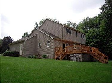 Lovely 3 Bedroom 3.5 Bath vinyl sided 2 story perfectly nestled onto a private .71 acre lot. You will enjoy this home's popular floor plan w/hardwood floors & fully equipped kitchen which is accessible to the large private back deck. Living room features a brick gas fireplace w/French doors to formal dining area. Relax in the master suite which features a WIC & bath w/jetted tub and shower . Entertaining will be easy in the finished lower level family room w/bar. Conveniently located. Home Warranty.MBG