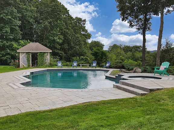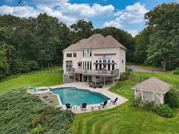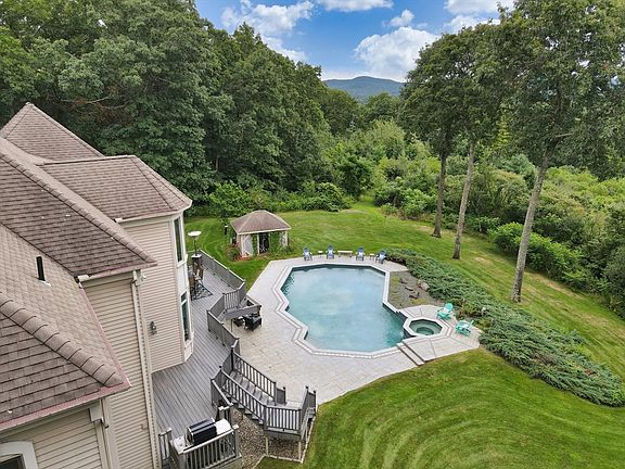 Experience luxury living in this stunning 4-bedroom, 5-bathroom estate spanning over 7 acres of lush and private land. Boasting 7,000 sq ft of exquisitely designed living space, this home features an open floor plan perfect for hosting, complemented by a finished basement. The Chef's kitchen includes a breakfast area with custom quartzite counters, leading to the family room with cherry cabinetry showcasing the gas fireplace and floor to ceiling windows for the unmatched views. Outdoors, indulge in the heated in-ground saltwater pool and hot tub, all within a fenced-in yard overlooking the breathtaking mountains. Enjoy the unbelievable sunsets and views stretching to the Berkshires on the large deck or patio. Located just 1 mile from U-Mass Amherst and 2 miles from Amherst College, this property offers unparalleled convenience and elegance.