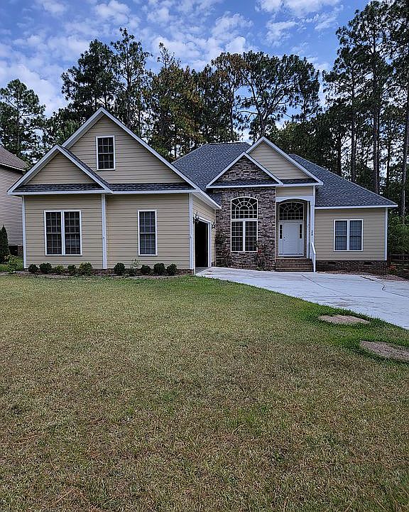 Architectural design with side entry Garage on Cul-de-sac. Carolina Lakes. - Beautiful home with 4 Bedrooms & 3 Bathrooms. Cathedral Ceiling in Great Room with Hardwood floors & stone fireplace. Downstairs Master Bedroom Suite has Cathedral Ceiling, Dual Sinks, Jetted Tub, and Separate Shower. Split bedroom plan provides 2 more bedrooms on the main floor. Even Hall bathroom has Jetted Tub! Upstairs bedroom and Roomy Bonus Room with easy access storage areas and full bathroom. There are 3 heat pumps for zoned temperature control. Located in gated community of Carolina Lakes, with boating lakes, community pool and clubhouse, fitness trail, playgrounds and lots of friends to meet.
