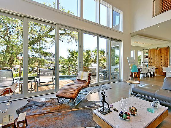 Modern Luxury with Deep-Water Access, 5 Minutes to Downtown Charleston.This custom-home built in 2013 on the Ripley Cove/Ripley Light Marina, features a pool deck looking over the marina with a 50-ft deeded boat slip equipped with water and electricity. The grand entrance leads to an open floor plan on the first floor with 23' ceilings and opening windows along the entire back of the home, capturing light and overlooking the Ashley River, marina and downtown Charleston. The kitchen boasts Bianco Gioia countertop slabs, backsplash and a waterfall island. The custom cabinetry, Thermador refrigerator, electric convection over, dishwasher, 45" hood, Wolf 15" cooktop module and built-in wine rack are perfect for entertaining. Take the floating staircase to the second floor to two ensuite bedrooms with private baths, one with a Jacuzzi tub. The third floor encompasses the master suite with a private rooftop deck. The luxury suite provides his & hers walk-in closets, Skyline marble and Ann Sacks glass tiles, Grohe 20" rainhead, water jets, hand shower, thermostat, water closet with bidet and two vanities. The elevator services all three levels from the garage to the master suite. Customized LED lighting and hardwood floors are found throughout the house and Sonos surround sound on the pool deck and living area. The garage is a perfect man cave, opening just steps from the boat slip. Don't miss this one-of-a-kind custom contemporary home with exquisite views and a convenient location.