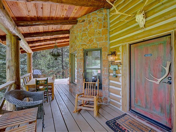This authentic 1,853 sq. ft. log cabin, fully re-chinked in 2022, offers 3 bedrooms and 2 baths. Designed with warmth and craftsmanship, the main floor features a cathedral-beamed living room with stone kiva fireplace, an inviting dining area, and a well-equipped kitchen with custom wood cabinetry. Large windows frame views of the Pecos River and the surrounding forest, filling the home with light and a sense of connection to nature. Two bedrooms and a full bath complete the first level, along with a dedicated laundry area.