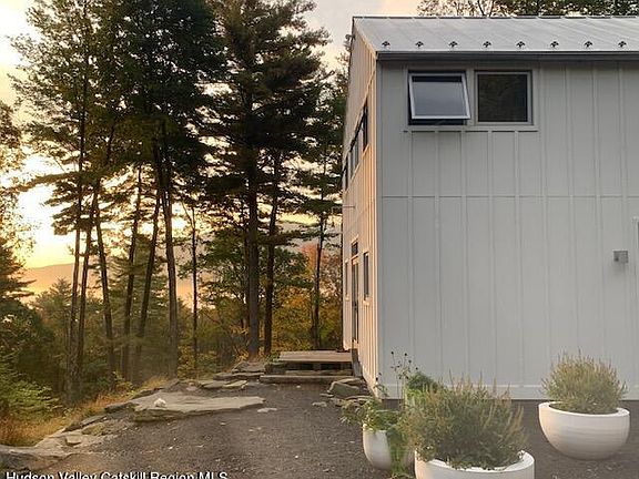 Down a long level driveway in beautiful Mount Tremper, you'll discover this extraordinary contemporary home, masterfully crafted from shipping containers. From the outside, it exudes the charm of a traditional house, but step inside and you'll discover a fascinating blend of industrial history and modern eclectic design. The main level is a vast open-concept space, thoughtfully divided into inviting areas perfect for relaxation and entertainment. A cozy den is set up for TV watching, while a sitting area by the woodstove invites you to unwind with a good book. The main living area is a highlight, framed by floor-to-ceiling sliding glass doors that capture breathtaking mountain views and open onto a spacious deck overlooking the woods and those stunning mountains. On the opposite side of the house by the large kitchen island, another set of sliding glass doors leads to a serene patio, creating seamless indoor-outdoor living. Ascending the hand-forged steel staircase, you'll find four generously sized bedrooms, each with vaulted ceilings that enhance their airy feel. The two large bathrooms on this level offer luxurious amenities, with one featuring a deep soaking tub and the other a walk-in shower. Throughout the home, the artistry of one of the homeowners, a skilled woodworker, is evident in the beautiful custom woodwork that adds warmth and character to every room. Set on over 8 acres, this property is a private sanctuary surrounded by lush greenery and woodlands. The land feels like a magical realm straight out of a Tolkien novel with its towering trees, ferns, rock outcroppings, and wildflowers. The property backs up to 140 acres of forever wild state land, offering nothing but the sound of chirping birds and the leaves rustling in the wind. Additionally, there is an approved area on the property for a septic system for a guest house, offering room for expansion. The property is located less than 15 minutes from both Phoenicia and Woodstock. Provisions and a variety of dining options can be found in under 10 minutes.