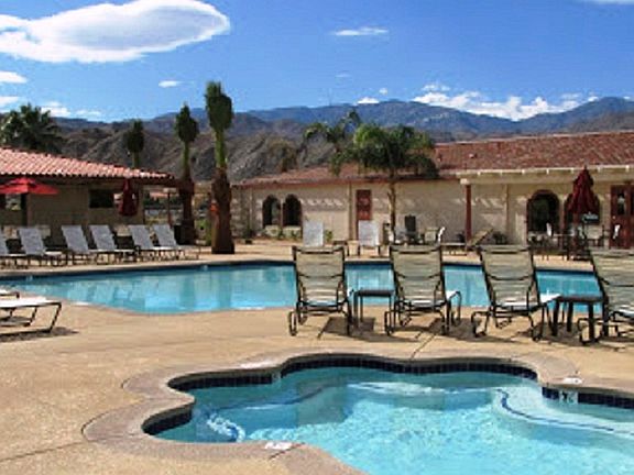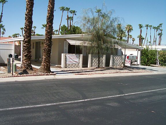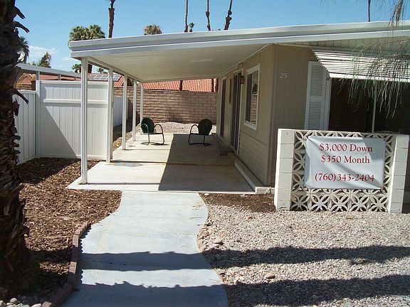 Affordable Resort Living! Only $3,000 dn. and $350 a month! Located in Date Palm Country Club, the deluxe manufactured home resort centrally located to everything in the Palm Springs Resort communities, 25 Via Valverde is the best value for senior living. Enjoy 5 Sparkling pools, Saunas, Tennis courts, dog park, Modern Gym Beautiful Golf Course, all year Restaurant and events too numerous to list here. Gated entry is staffed and the club has regular patrols for added security! Space rent only $985! As to your new home, it's a 2 bedroom 2 bathroom 1160 Sq.Ft. Open floor plan home with so much closet space you will need to go shopping! Luxurious hardwood floors in every room and bright fresh paint. The Kitchen features gas appliances and acres of counter space, built in Dishwasher, pantry and bright lighting will make you want to expand your Thanksgiving guest list. The Great room features space for lots of friends, a dining area and lots of windows. Both Bathrooms are completely new and modernized, Tankless water heater means endless HOT WATER Centrally located laundry area. Covered parking for 2 or 3 cars. Large shed for additional storage and a large backyard with mature citrus tree. A large porch for quiet morning coffee just outside the master suite and a large front porch for enjoying our spectacular weather with friends and Family. OPEN HOUSE SATURDAY from 10 – 2 Call 760-343-2404 for more information.