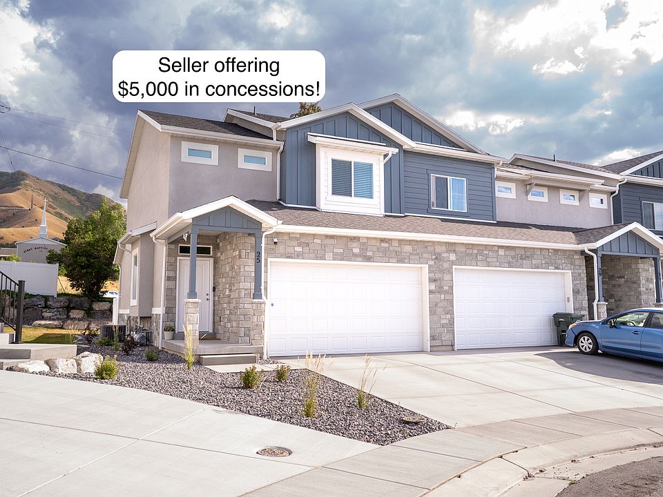 Seller to contribute a total of $5000 in concessions! You decide how to use it, rate buy down, closing costs and/or HOA transfer fees! Nestled in the heart of Tooele, this location offers the perfect balance of small-town charm and modern-day convenience. You'll be just minutes from scenic trails, parks, golf, and downtown shops and dining. Inside is end-row unit, enjoy a spacious open-concept layout with 9' ceilings, large windows that let in plenty of natural light, and durable LVP flooring throughout the main level. The kitchen features granite countertops, dark-stained cabinetry, a center island, pantry, and a main-level half bath. Upstairs, find a convenient laundry room and primary suite with a walk-in closet! The fully finished basement includes a wet bar, ideal for entertaining! Square footage figures are provided as a courtesy estimate only and were obtained from County Records . Buyer is advised to obtain an independent measurement.