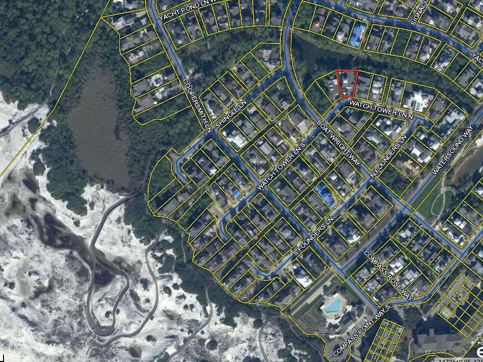 Wonderful large pie shaped lot on a very private street in WaterSound. This lot has 85 feet on the Yacht Pond and should have gulf views directly down Watch Tower Lane to the beach.This lot will have great permanent gulf views, better than many homes even in the 2nd or 3rd Row. A great lot on the south side of WaterSound. Construction start date i 2021-10-04