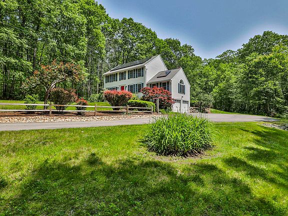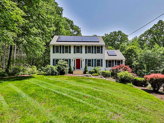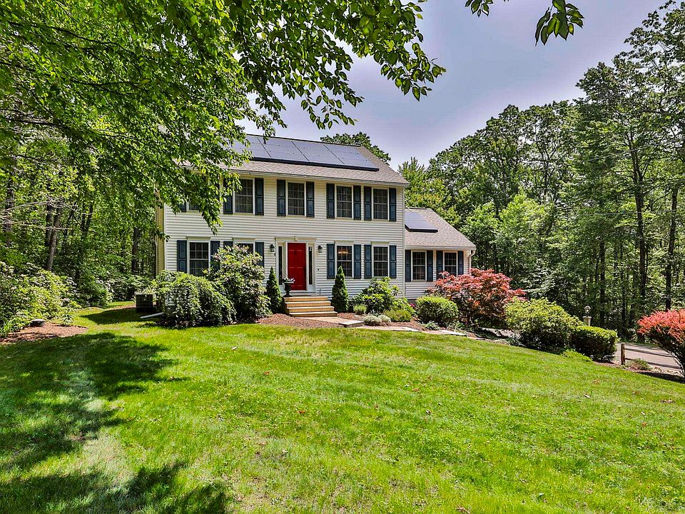 This charming Brookline colonial sits on 3.26 acres of land that abuts conservation land and provides a private, beautifully landscaped setting. The home had been updated throughout and includes a new kitchen with quartz countertops, a huge center island and new appliances. The 1/2 bath on the first floor includes a laundry center with a stackable washer and dryer. The family room is located off the kitchen and boast cathedral ceilings, a pellet stove and hardwood floors. The entryway, sitting room and dining room also include hardwood floors. The carpet on the stairs was recently replaced leading to hardwood in the upstairs hall and carpet in the 3 bedrooms. The primary suite includes a 3/4 bath, that has been recently updated, and a custom walk in closet. The solar panels are owned by the seller and will convey with the house at no charge to the buyer. The walkout basement has potential to be finished and leads to a drive under 2 car garage and includes a portable generator. Don't miss out on this rare opportunity to be part of the award winning Hollis/Brookline school system. Call today for a private showing.
