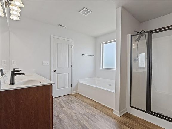 The main level offers a convenient 5th bedroom next to a full bath—perfect for guests or a home office. Upstairs, the luxurious master suite features a relaxing sitting area, a walk-in closet, and a spa-like bathroom with a separate garden tub, shower, and double vanity. Three additional bedrooms, another full bath with new cabinetry, and a laundry room complete the second floor.