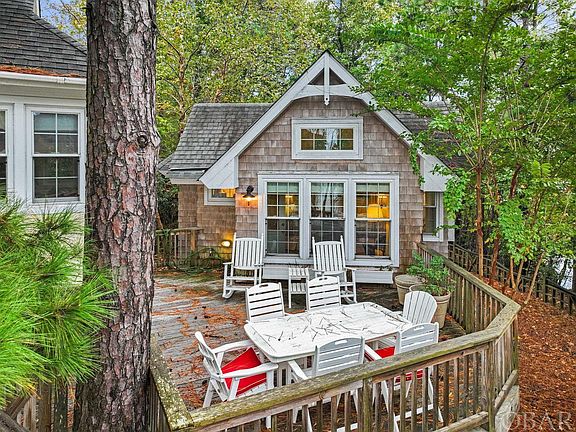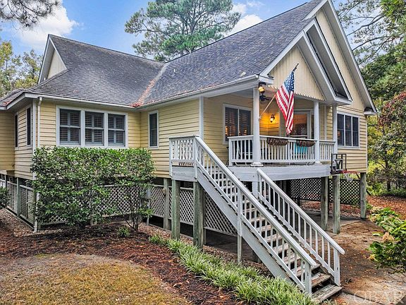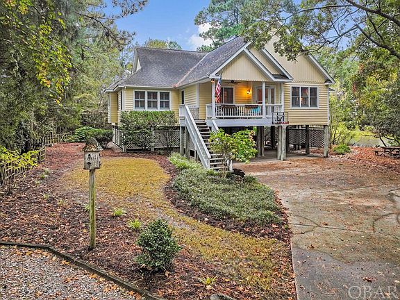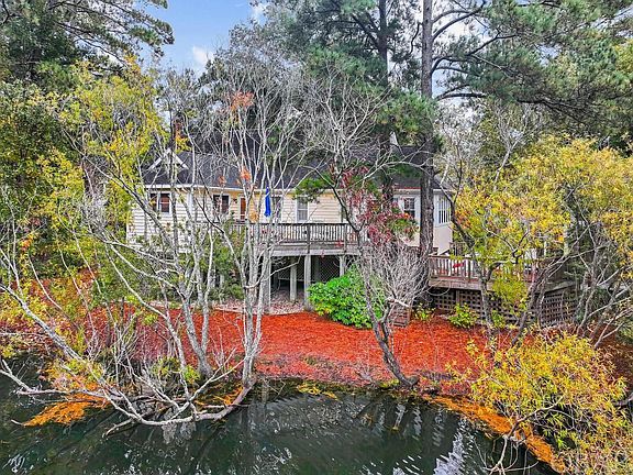 HUGE PRICE REDUCTION!!! Gorgeous PONDFRONT in Southern Shores! 5 bedroom, 3.5 bath perched right on Duck Woods Pond. This home is in great shape. Nice bright, tiled kitchen with track lighting and cathedral ceiling.  Wash dishes looking out over the beautiful WATER VIEWS. It has a separate full under-the-counter ice maker. The living area has hardwood floors and a cathedral ceiling. It also has a gas fireplace but that has not been used in a while and there is no gas tank presently on the property.  Hardwood floors throughout the home except for attractive tile in the kitchen and bathrooms. The master bedroom has views of the pond and a door out to the large inviting 12 X 16 Carolina room which is heated by the Split Pack as well as the studio.  Off of the main living area is a bedroom/office.  You also have a full bath right off the main hall. There are two more bedrooms with a Jack and Jill style bath in between. One of these bedrooms has a slider to a private deck that also has a door to the Carolina Room. On the pond side of the home you have a very large multi-level deck overlooking Duck Woods Pond. We have an estimate from Albemarle Landscapes for $3,100 as the cost of taking out most of the growth to open up the views of the pond in Associated Docs. There is a separate inviting 244 square foot study/studio at the south end of the deck with a half bath and is uses the split pack for heat and air. This has sets of windows on three sides with views of the pond from each set, a cathedral ceiling and a built-in window seat with storage drawers underneath. This heated square footage is NOT COUNTED in the MLS Heated Living Area Square footage of 2,128. Together they add to 2,372 square feet. Underneath you have a huge amount of under-house parking and an outside shower as well as two storage rooms. One storage room is 225 square feet and the other is 168 square feet. Basketball goal. The Pond Prowler boat mounted under the home conveys with seats, trolling motor, battery, charger and paddle. Huge waterfront lot! Long winding driveway. Beautifully landscaped with a natural look maintained by Julies Landscaping with an irrigation system but NO GRASS TO CUT. This is one of the nicest areas of the pond. Duck Woods Pond is ¾ of a mile long and is loaded with ducks, geese, herons, egrets, hawks, osprey, turtles and plenty of bass. Very private. Located on a nice, secluded side street/cul-de-sac. Very private area of the OBX yet easy to walk/bike to shopping, restaurants, grocery stores, Duck Woods Country Club, Kitty Hawk Elementary etc. Look in Associated Docs for county As Built Survey, Aerial Photos, RPD/MOG, Expenses, Insurance Info, 1998 Improvement Permit showing 5 bedrooms etc. The mini-split system was replaced 2018; the Trane outdoor unit was installed 2014; the LG outdoor unit was installed 2007 and it’s compressor was replaced 2022; all systems were serviced 2022. The built in bench seats offer storage underneath. The Polybutylene plumbing has been replaced. All new insulation and underpinning underneath the home. For $65 per year the Southern Shores Civic Association lets you take advantage of three Sound side Marinas with boat launch and picnic and crabbing areas, Private Sound Beach with playground, thirty-four Private Ocean Beach accesses, parks, basketball and soccer fields.  Join the SSCA tennis for a small additional fee. Check out the Virtual Tour. Combo lockbox, Vacant EZ to show.