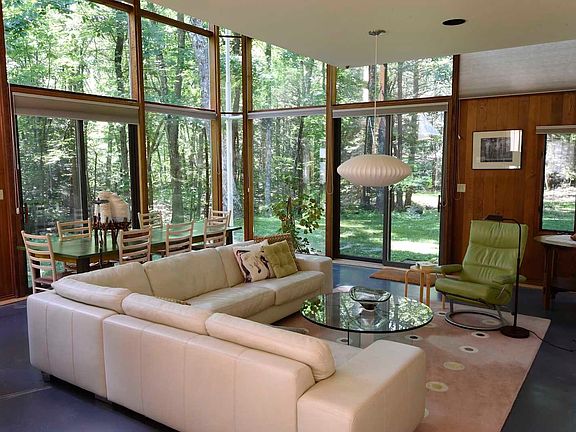 Paradise Found at the end of a bucolic country lane completely secluded deep in a wooded glen. This contemporary house is artistically designed by the current owner in concert with a renowned architect, built in the style of Frank Lloyd Wright with lovely spareness and with a mid-century flair. Large plate glass windows in the double story living room create a sense of wonder year round with ever changing views of the natural outdoor landscape. A fantastic kitchen and a screened dining porch are a cooks delight. A separate 1000 sqft heated artist's studio is privately set near-by down a short woodland path from the house. Conveniently located half way between the Taconic Parkway and Rhinebeck/Red Hook this property is the perfect getaway or full time residence.