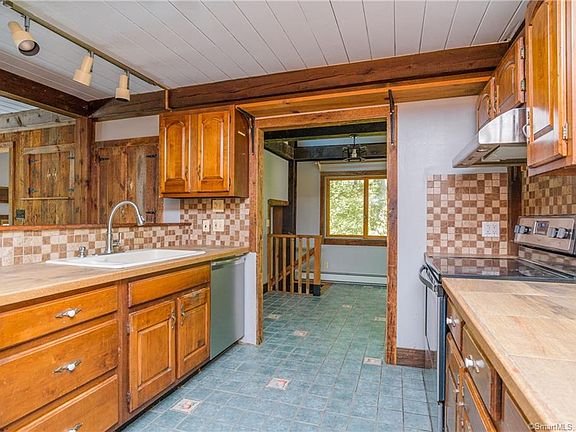 Seize the opportunity to live in this incredible quality custom built Contemporary/ Cape home in a wooded setting offering serenity and privacy. It comes with 4/5 Bed, 2.5 bath. The "heart" of this home is the 2 story great/living room with fireplace that opens to the dining room and kitchen with stainless appliances. Charming and private, you will never find another home like this one. This house has "Pin Board" interior paneling (pockmarked with tiny holes left by nails driven into to the wood). Many updates such as propane boiler/hot water heater, well pump, well cap, new shower, front door etc.. Freshly painted inside/out. The walk-out lower levels feature an additional 728 sf of heated finished space to include 2/3 beds, full bath, laundry room. Private setting in convenient location! Relaxed elegance can be achieved in this immaculately cared-for, low maintenance home, offering a year-round vacation lifestyle that is less than 75-90 minutes from Manhattan. Amazing opportunity for year round living, or for the weekender. Perfect set up with a separate building / cottage over 2 Car garage makes this property suitable for a home business or possible in-law set up. Home is a must see to really appreciate the natural sunlight that brightens the home throughout.