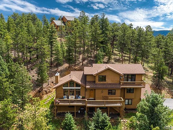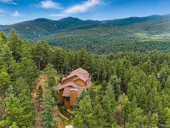 Enjoy the most stunning mountain views from every corner of this spacious mountainside retreat. Beautiful open floor plan with cathedral ceilings, cozy moss rock gas fireplace to curl up near on cold nights, and a lovely formal dining space with french doors opening onto a shady patio space. Large kitchen with 42" oak cabinets and double pantry space. Two nicely sized bedrooms on the main level with private full sized bath. Upstairs you'll find the ultimate sanctuary space with a large master bedroom with private balcony and epic mountain views to greet you every morning. This master retreat also features a walk in closet, linen closet, as well as a large five piece bathroom with large soaking tub, shower and private water closet. Invite your friends for game day and enjoy the lower level family room space with wet bar. The basement also features a full bathroom, office, and laundry space. The unobstructed views of Mount Evans, Rosalie Peak, Evans Ranch, and surrounding forest area area are simply breath taking. Don't miss your opportunity to own this slice of heaven! Showings begin Saturday 7/10.