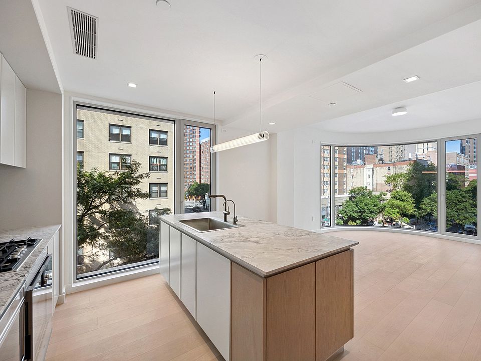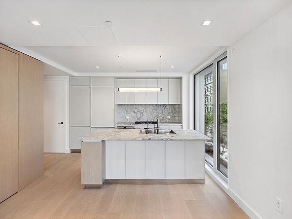 Brand New Condo available now! Optional extra storage available. A bright and expansive corner one-bedroom haven, Residence 4D is bathed in natural light streaming through oversized floor-to-ceiling windows. The open-concept kitchen is a statement in modern design, showcasing exquisite marble countertops, a bold designer backsplash, and a central island framed by glossy white lacquer cabinetry. Fully integrated high-end appliancesincluding a Thermador refrigerator and Bosch dishwasherdeliver effortless functionality. The residence is outfitted with central air conditioning, an in-unit washer and dryer, and a smart entry system for ultimate convenience. The residence includes a custom-built office designed for focus and functionality. Crafted with precision millwork, the workspace features soft-close drawers, integrated shelving, and discreet grommets for clean cable managementoffering a sophisticated and productive environment for remote work. The primary bathroom is a serene retreat, adorned with Bianco Sivec marble, radiant-heated floors, and custom oak vanities. Wide-plank oak flooring flows throughout the home, complemented by generous closet space and the option for additional storage. Begin your day in the striking double-height lobby, then unwind in the resident lounge or landscaped courtyard, complete with elegant outdoor seating. A dramatic spiral staircase leads to the fully equipped fitness center, featuring top-tier cardio equipment, free weights, and a serene private yoga studio. Adjacent, the wellness spa invites you to recharge with a steam room, sauna, teak slip-resistant floors, cool-down shower, and towel service. For elevated outdoor living, the rooftop terrace offers panoramic views, barbecue stations, lounge chairs, and al fresco dining areasperfect for gatherings or peaceful evenings under the sky.