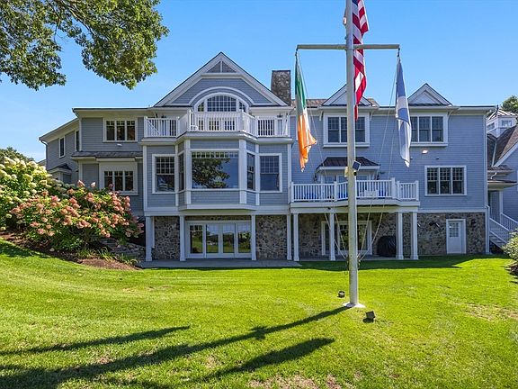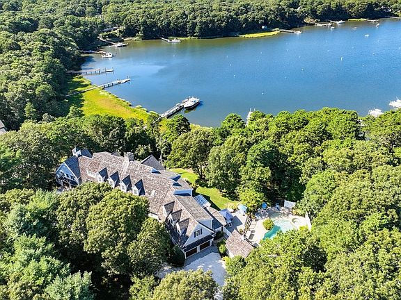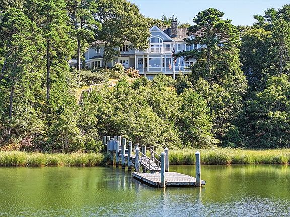 Set on a bluff overlooking Prince Cove, this extraordinary waterfront estate was meticulously designed and built with no expense spared. From the private deep-water dock with access to Nantucket Sound to the expansive pool terrace with a cabana and pool house, every detail was thoughtfully planned to embrace the surrounding natural beauty with unmatched luxury. Immediately upon entering the residence, elevated quality and craftsmanship are readily apparent in the foyer with 4'' wide Red Birch floors, raised panel walls, and wainscoting. At the heart of the home, an open concept layout seamlessly flows between living, dining, and cooking spaces. Breathtaking water views, coffered ceilings, and a see-through fireplace set the stage in the family room, with access to a spacious waterside balcony.