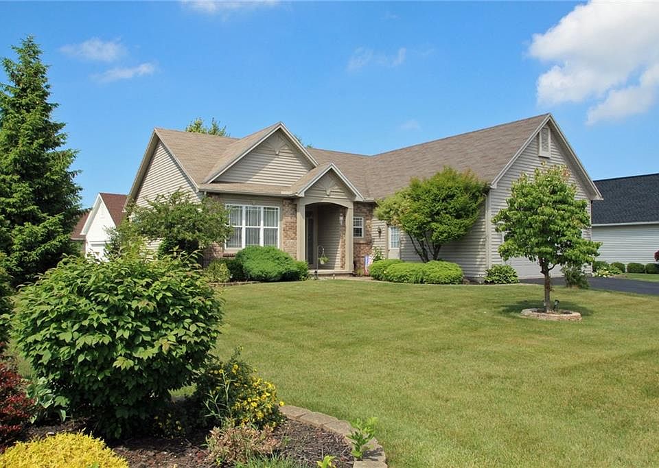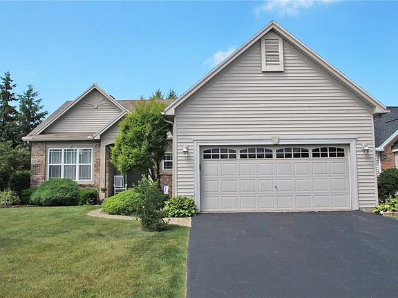 Elegant one owner ranch patio home! Gleaming hardwoods in the Living Room, Dining Room, Kitchen and Den/Bedroom! The eat in Kitchen features maple cabinets, Stone backsplash, new lighting and an angled peninsula over looking the formal dining room! Loads of custom trim and crown molding through out the Kitchen, Dining room, and Living room! The living room boasts a custom gas fireplace, Hardwoods and columns between the living room and dining room. Master suite with full Bath and large walk-in closet. Sun porch off the back of the dining room! Landscaping beds with custom curbing. Don't miss this great home! Near Rt. 390 and Wegmans!