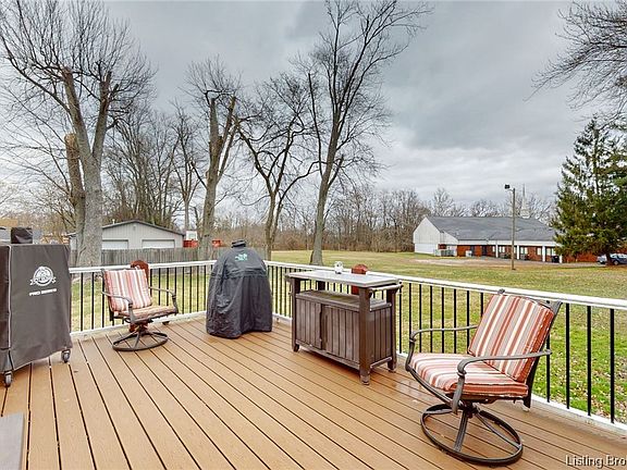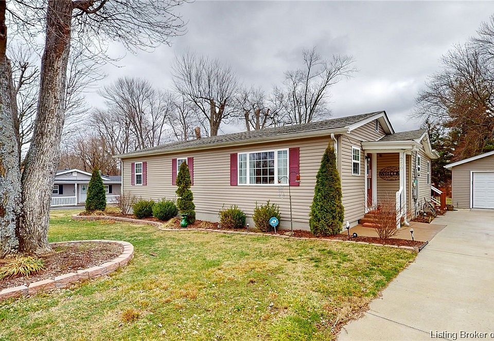 Convenient location under 1 mile from Charlestown schools, this recently renovated 2-bedroom 2-bath home hosts an array of updates you have to see to believe! The exterior is framed w/ new landscaping, mature/freshly trimmed trees, and a spacious lot. A concrete driveway leads to a 2.5-car detached garage w/ updated door openers. Home has an updated & recently serviced HVAC system as well as an updated water heater. New flooring throughout the home and updated lighting fixtures along w/ new remote controlled ceiling fans add extra dazzle! An open floor plan and an expanded kitchen sparkles with granite countertops and a glass tile backsplash! The eat-in/island bar and dining area is full of natural light from the double opening doors leading to a brand new, all-weather lumber deck! The large backyard hosts multiple sitting areas great for enjoying the outdoors! A separate laundry area off the kitchen that is easily accessible and easily closed off adds to the functional design. The updated primary bath w/ a whirlpool tub sits adjacent to a nice sized secondary bedroom in the hall that takes you to the extra-large Master Suite! The amazing double sized master hosts double closets, a full bath and plenty of room for a quiet, private office, nursery or comfortable reading area. Roof replaced in 2019. Inspections are welcome at buyers expense, but property sold as-is.