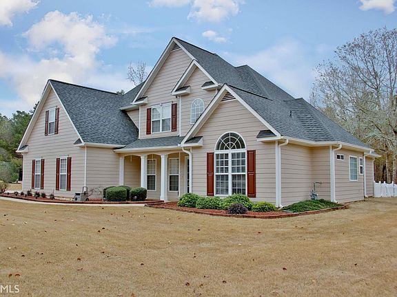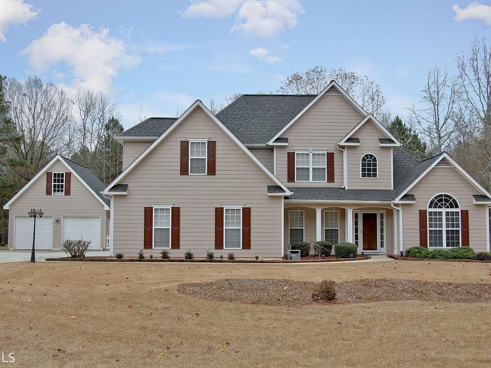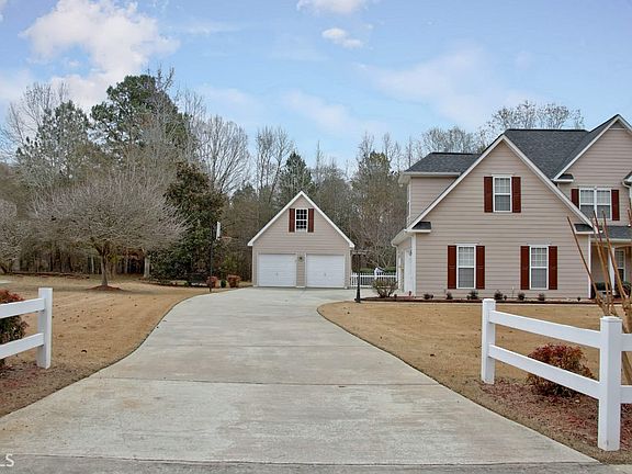 Awesome home in sought after Starr's Mill School District. Two story foyer with hardwood floors, formal living and formal living/office. Bright and open two story family room with fireplace. Large kitchen with breakfast bar, tons of cabinets and counter space, large breakfast area, granite counters, SS appliances, hardwood floors, and pantry. Laundry room off kitchen area with cabinets. Master suite on main level with trey ceiling and door to patio in back. Master bath with jetted tub, separate shower, toilet room, tile floors, tiled backsplash, and walk in closet. 3 bedrooms up with 2nd bath. Private back yard with fence. Mans dream with a 2 car side entry garage plus a golf cart garage and 2 car detached garage with storage on 2nd floor.