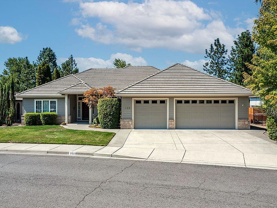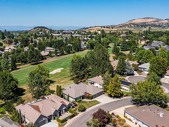 Stunning, contemporary single level 3 bed, 3 bath home perfectly positioned on the Rogue Valley Country Club! Walls of windows frame expansive, unobstructed views of the 8th fairway, filling the space w/abundant natural light. The split bedroom, open concept layout boasts clean lines, high end finishes & a continuous flow between the living, dining & kitchen areas - ideal for both everyday living & entertaining. Luxurious primary suite featuring a large walk-in closet, private patio access & spacious ensuite w/two vanities, a jetted tub, tile shower & private water closet. Gourmet kitchen equipped w/an oversized island, granite countertops, double ovens, appliance garage & gas cooktop. Additional features include hardwood floors, gas fireplace w/granite surround & mantle plus a dedicated laundry/mud room w/built-in cabinetry, work area & utility sink. 3-car garage, tile roof & mature, easy-care landscaping with a spacious covered patio & convenient remote-controlled sunshade.