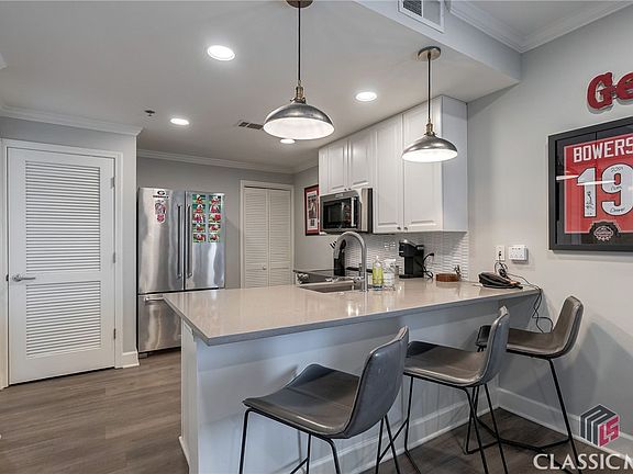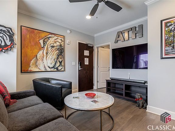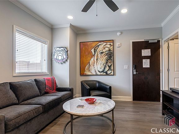Rare end unit condo in the highly sought after Georgia GAMEDAY Center! This 2 bedroom, 2 bath upgraded condo with a window in the living area is a must see. Upgrades include: LVP flooring, quartz countertops in the kitchen, newly tiled bathrooms and showers, updated vanities, and stainless appliances. The second bedroom balcony offers views of UGA, Sanford Stadium, and the Arch. Condo is fully furnished with all living room, kitchen, and bedroom furninshings included in the list price. Georgia's GAMEDAY offers 24/7 front desk staff, an exercise room, a Club Room, as well as housekeeping, and an on-staff handyman. There's even a gated dog walk by the parking garage. Walk to downtown to shops and dining, UGA Campus, and Sanford Stadium. Condo may be leased through the on-site management company. This property inludes one onsight, covered, numbered parking space.