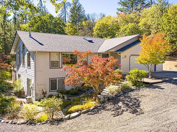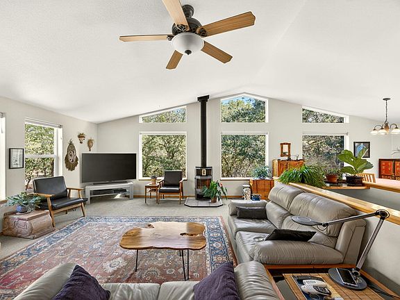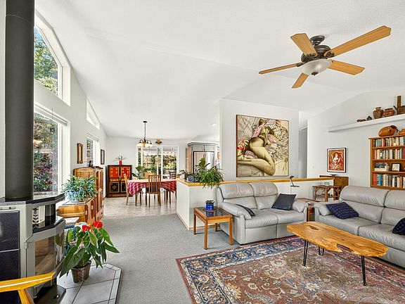 Welcome home to this custom-built, move-in ready retreat! The vaulted living room is complete with a free-standing woodburning stove and perfectly placed windows to let in an abundance of natural light. The dining area is conveniently located next to the kitchen with slider access to the oversized deck with retractable awning, overlooking the lush backyard and seasonal creek. The open kitchen has a gas range/oven, plenty of counterspace and storage, plus a skylight. The vaulted main level primary suite offers dual closets, dual sinks, tiled walk-in shower and an adjoining office. Downstairs you'll find pine ceiling detail in the 4th bedroom & bonus living space with outdoor access. Interior laundry leads to the two-car garage. Mature landscaping surrounds the property including fenced raised garden beds. Detached shed for extra storage. New roof recently installed + reinstalled solar panels.