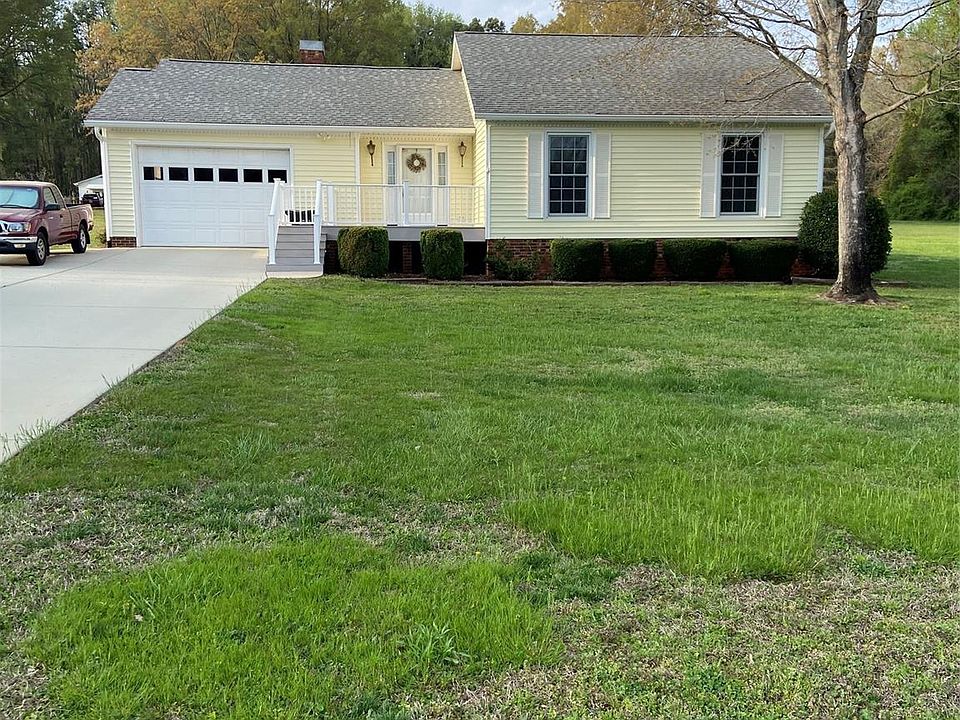 Beautiful home in a country setting, close to major highway, I-85. This home has approximately 1160 sq feet, with 3 bedrooms, 2 full bathrooms, eat in kitchen and spacious great room with fireplace. Single attached garage, and large Bunce outbuilding. This home sits on .97 of an acres. Front porch with composite decking and vinyl railing.