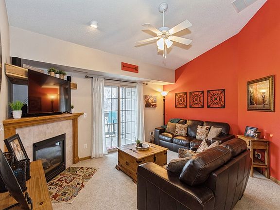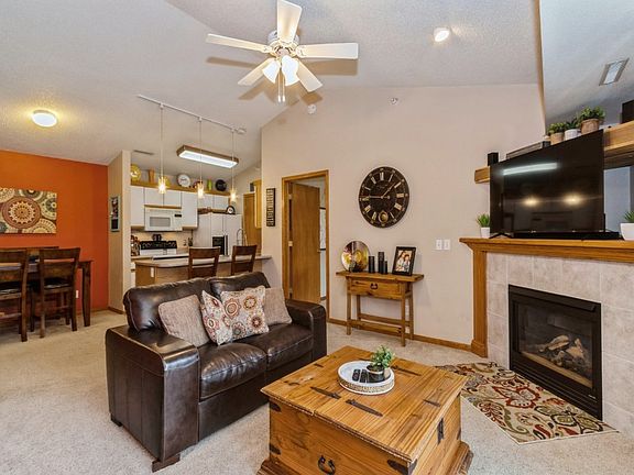 Nestled alongside the golf course, close to Target, and a short distance to Starbucks, surrounded by trails & parks this makes the perfect place. With fiber optic internet (great for those home offices) and low utilities. Come on into this lovely unit with elevator access! Freshly painted, with updated light fixtures, vaulted ceilings, open concept from the kitchen looking out into your living & dining room. This unit has a beautiful fireplace in the living room and two sets of sliding glass doors onto your spacious deck! You can access the deck from either the primary bedroom or living room. Primary bedroom features this one of a kind accent wood wall, a walk-in closet, laundry situated in its own area off the primary bathroom. Second bedroom and bathroom are spacious, great closets and storage! Pets allowed, elevator access, 1 stall garage, and beautiful green courtyard. The low $215 monthly association fees (no additional start up fee) covers water, trash, recycling, snow removal, lawncare, and internet!