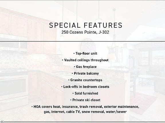 - Amenities included: Ski Closet, Snow Removal