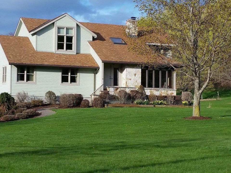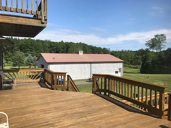 WOW, what a property ! Lovely custom home nestled on 4.87 Acres w/ beautiful views, garden w/ water & elec & apple trees. 4 bedrooms, 2 full baths + 2 partial, 1st FL office & laundry, screened sun rm, 2 tier deck w/ above ground pool, 2 car under the residence garage w/ work shop area. There is also a HUGE 36' x 60' wood detached garage/building w/ electric (6-8 cars) + KIDS PLAY HOUSE ($50,000K value), 20 x 20 shed & generator hookup. This home has 2 heat choices/furnaces: Hot air/wood or Baseboard/oil.