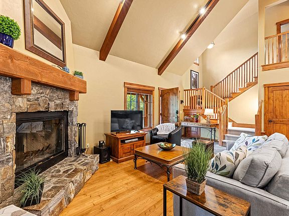 Creekside Setting in this Sawtooth Chalet in Tamarack Resort. Such tranquility, yet still with great access to all that the resort has to offer. Featuring the coveted wrap-around covered deck with fireplace in this chalet floorplan. Fully fenced in, including the private hot tub, your furry friends or kiddo's can roam freely on the deck while you entertain or just relax and listen to the sound of the creek. Enjoy the rustic mountain feel with plank wooden floors, alder cabinetry, vaulted ceilings, wood burning fireplace and slate tiled entryway. Spacious en-suite upstairs with a 2nd guest suite and 3rd bedroom on main level. Single car attached garage with additional parking space, just steps from the groomed, mixed use Cottage Trail System. Offered turnkey, with newer carpets, furnace and dishwasher.