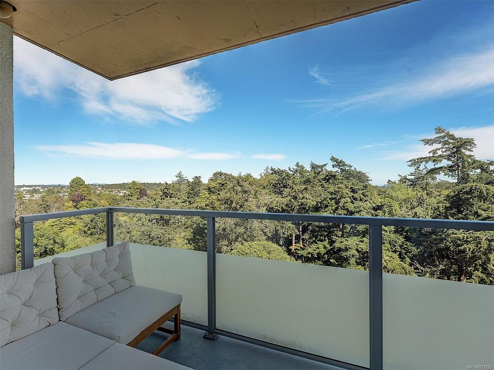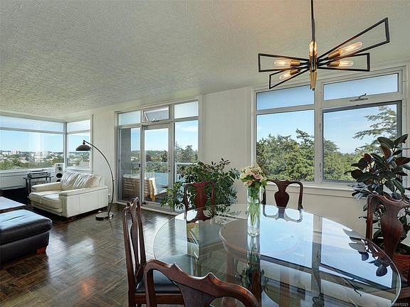 This unit is a must see! Enjoy sunrise & sunset from this corner 9th floor 2 bed suite overlooking Beacon Hill park & waterways. In the prestigious steel & concrete "Bickerton Court". This unit offers oversized windows for the best possible light & to enjoy the city & water views. From here you can walk along the ocean,world famous inner harbour, James Bay, downtown & popular Cook Street Village. Designer custom features throughout: quartz countertops, Bosch appliances, modern lighting, soft close drawers + under counter lighting all in a fresh palette. Bathroom features quartz, tile + walk-in glass shower, heated floor & exposed concrete giving it a Gastown vibe & feel. Being up this high, you share the skies with eagles & herons: it is an amazing feeling! Bickerton offers an indoor heated POOL, billiards, exercise + social room, library, guest suite, workshop, bike storage, car wash area, courtyard for BBQ’ing, laundry room, roof-top lounge w/360 degree views over the city & ocean!