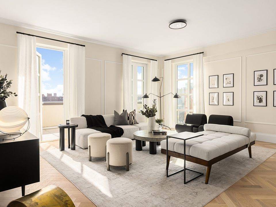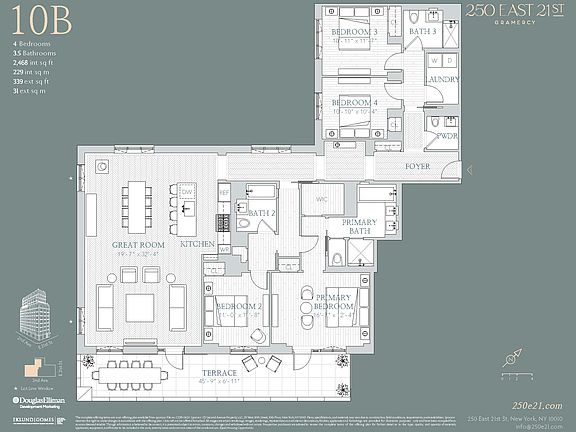 With interiors designed by the celebrated Paris Forino, Residence 10B at 250 East 21st Street is a 2,468 square foot four-bedroom, three-and-a-half-bathroom home with 339 square feet of private outdoor space. A formal entry foyer opens to the generous great room, with hand-laid White Oak herringbone wood floors, exceptional custom wall paneling, and oversized windows. The thoughtfully designed kitchen features a best-in-class fully integrated suite of Miele appliances, including a gas range with built-in wall cabinet hood, refrigerator, and dishwasher. Custom millwork cabinetry is embellished with custom bone pulls and bespoke Waterworks nickel fittings and is paired with Tundra marble countertops and backsplash. The kitchen also includes a Liebherr wine refrigerator and stainless steel undermount sink with an InSinkErator disposal. Central to the home is the expansive private terrace, over 40 feet in length. With eastern exposure, this private terrace is opportune for morning sunrises and endless entertaining. The serene primary bedroom suite features a large walk-in and ancillary closets, and direct access to the private terrace. The five-fixture primary bathroom, clad in Crystallo Pearl marble, features custom sconces flanking the elegant metal and millwork vanity with saddle leather pulls, and is finished with bespoke Waterworks fixtures in polished nickel. Secondary bedrooms are provided with ample closet space, while the secondary bathrooms feature custom White Oak vanities topped with Vanilla Pearl marble, Silveran marble floors, and Glazed Crackle tile walls and tub surrounds. Just off the entry, the glamorous powder room is finished with White Oak flooring and a custom vanity with Grande Antique marble. A dedicated laundry room includes a Miele front-loading washer and dryer. Boutique in scale, rich in character, 250 East 21st Street is perfectly situated in one of the city's most iconic and celebrated neighborhoods, just steps away from the park. Tree-lined streets lead to a classic contemporary address, designed to blur the boundaries between indoor and outdoor living. The homes are enhanced with a suite of wellness and social amenities, including two landscaped rooftop parks with views of New York's most iconic landmarks. The second-floor landscaped Yoga Garden shares adjacencies to the Fitness Center, with LifeFitness cardio and conditioning equipment, and a beautifully appointed Residents' Salon. Additional conveniences include a 24-hour attended lobby, dedicated bicycle storage, and private storage available at an additional cost. The complete offering terms are in an offering plan available from sponsor. File no. CD19-0420. Sponsor: SD Second Avenue Property, LLC. 29 West 30th Street, 10th Floor, New York, NY 10001. Plans, specifications, and materials may vary due to construction, field conditions, requirements, and availabilities. Sponsor reserves the right to make changes in accordance with the offering plan. Units will not be offered furnished. All images are artist's renderings. Images, renderings, representations and interior decorations, finishes, appliances and furnishings are provided for illustrative purposes only and have been compiled from sources deemed reliable. Though information is believed to be correct, it is presented subject to errors, omissions, changes and withdrawal without notice. Prospective purchasers are advised to review the complete terms of the offering plan for further detail as to the type, quality, and quantity of materials, appliances, equipment, and fixtures to be included in the units, amenity areas and common areas of the condominium. Equal Housing Opportunity.