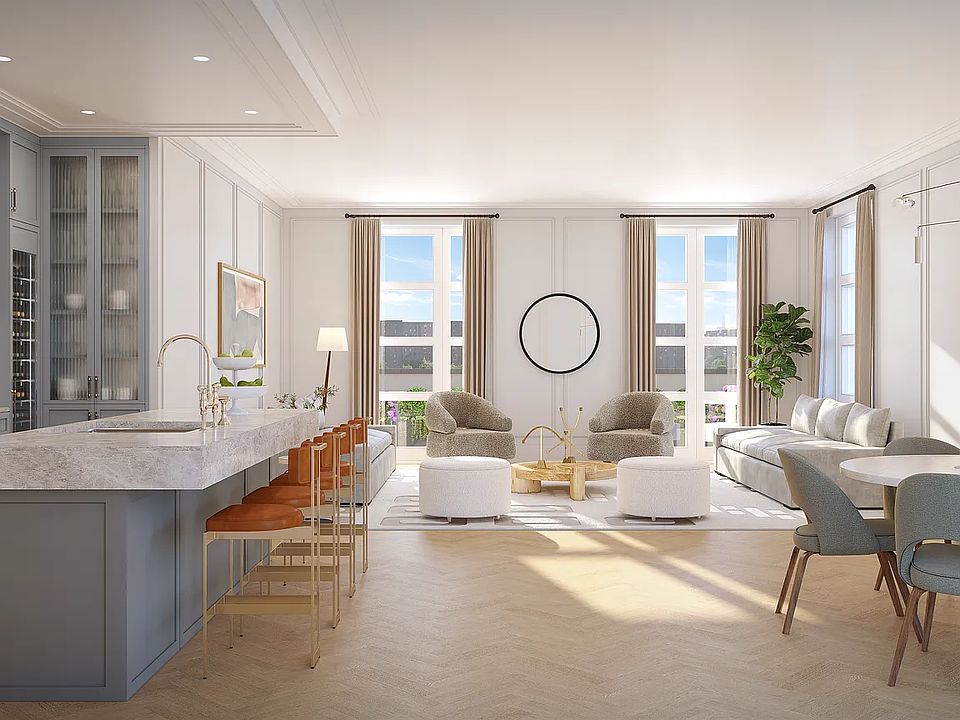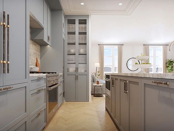 White Oak herringbone wood floors and spectacular custom wall paneling run throughout the primary living spaces, while the gracious living room is punctuated with an oversized window. The custom-designed kitchen features a best-in-class fully integrated suite of Miele appliances, including a gas range with built-in wall cabinet hood, refrigerator, and dishwasher. Custom millwork cabinetry is embellished with custom bone pulls and bespoke Waterworks nickel fittings and is paired with Tundra marble countertops and backsplash. The kitchen also includes a stainless steel undermount sink with an InSinkErator disposal.