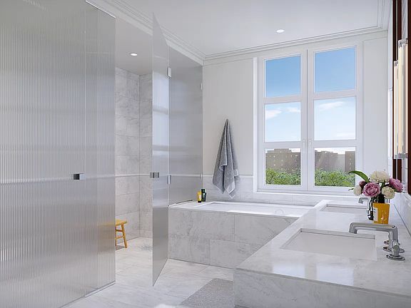 A private primary bedroom suite features two large closets and an en-suite four-fixture primary bathroom sheathed in Crystallo Pearl marble. Custom sconces flank the elegant metal and millwork vanity with saddle leather pulls, finished with bespoke Waterworks fixtures in polished nickel. The separate secondary bedroom is provided with ample closet space, while the secondary bathroom features a custom vanity topped with Vanilla Pearl marble, Silveran marble floors, and Glazed Crackle tile walls and tub surround. The home is also equipped with a Miele front-loading washer and dryer and a dedicated entry closet.