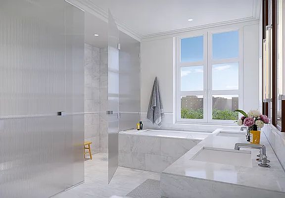 The serene primary bedroom suite features a large walk-in closet and a windowed five-fixture primary bathroom, clad in Crystallo Pearl marble. Custom sconces flank the elegant metal and millwork vanity with saddle leather pulls, finished with bespoke Waterworks fixtures in polished nickel.