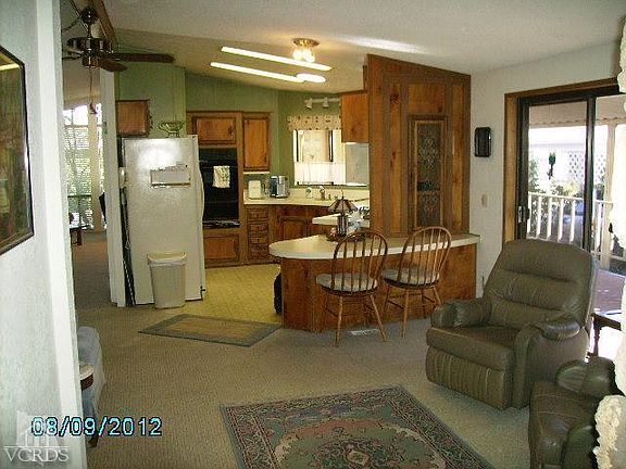 This home is priced for a quick sale. A large covered patio protects the front door which opens into large living room with ceiling fan, and formal dining area with built-in hutch. Kitchen features include all wood grain cabinets with roller drawers, pantry and breakfast bar. A skylight keeps the kitchen bright during the day. Family room includes a beautiful gas/wood burning fireplace with a ceiling fan. Laundry room has wood grain wall cabinets and countertop area for storage. Master bedroom has walk-in closet with mirror doors, linen closet & room for full bedroom suite. Large master bath includes two sinks, soaker tub & separate shower. Second bedroom shares a second bath which features large counter space & tub/shower. Window coverings features wood blinds in many rooms. Widened covered carport allows easy parking & runs length of home. Large shed with concrete floor & work bench is included for storage. Nice landscaping with delightful plantings & concrete patios for entertaining