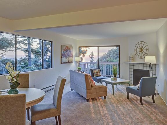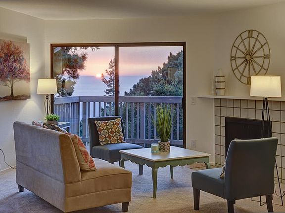 Nestled in the treetops, this lovely Tanglewood condo has all the amenities you are looking for including fabulous views of surrounding nature and the mighty Pacific Ocean beyond. The interior has been freshly painted and new flooring installed throughout. Both the kitchen and bath have been upgraded with new countertops, high end appliances and pass though bar to large living/dining combo, along with new vanity and light fixtures. Enjoy sitting next to the fireplace on those cooler nights or sipping a glass of wine on the deck while watching magical sunsets. Washer/dryer closet located inside the unit with a separate storage area adjacent to the front porch. This Monterey location is a favorite for locals and weekenders alike with easy access to all the wonderful amenities our coastal community provides.