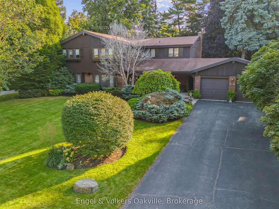 First time offered in over 50 years, welcome to 250 Gatestone Avenue! Pride of ownership in the sought after neighborhood of East Oakville , this custom built detached home by Jim McCLintock. The sprawling property of 100 x 150 ft lot size surrounded by mature trees is complete w/irrigation and shed (2020). The curb appeal and front entrance will charm you instantly , the driveway conveniently accommodating 6 vehicles with an additional double car garage ! Step inside the covered veranda to an oversized foyer featuring a solid wood staircase and lots of natural light from the bay window showcasing the front gardens. Elegant living room dining room open concept, carpet free w/custom wood wainscoting. The eat-in kitchen is complete with island, intercom throughout, desk area and walk out to a private deck ideal for entertaining in a cottage-like setting. The family room has a cozy wood fireplace and additional walk out to the backyard w/soaring trees , beautiful gardens and fire pit . The property is simply stunning! The home boasts over 3500 square ft of total liveable space, all five bedrooms on the second level are generous in size . The spacious primary has double door entry , ensuite privileges, walk in closet and a Juliet balcony overlooking the gardens. The lower level is timeless w/solid wood wet bar and bar fridge, oversized recreation room. Another cozy wood fireplace completes the room w/custom wood built in shelves. An additional bathroom , work shop, cedar closet and tons of storage! This home is special and wont last . Follow Your Dream , Home.