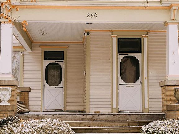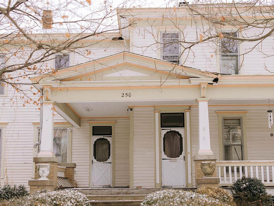 The elegance of what this grandiose home was is now concealed within the blank canvas of potential it currently offers. With many hidden gems inside this residence constructed around 1890, including some hardwood floors and light fixtures, door knobs, and the pièce de résistance-the gorgeous staircase and intricate work it showcases as you enter the front door. This home currently features two bedrooms and one bathroom on the main floor with an updated, functional kitchen. Upstairs holds the potential for two, perhaps three, more bedrooms and additional bathroom. The basement currently has a bathroom and laundry area with the rest of the space ready for your vision to come to life. Once outdoors, this home has great curb appeal with a wrap around porch where you can gather with friends and family or sit quietly after a long day. The carriage house out back is a fascinating piece of history that leads your imagination to run with what it could be today. This home is being sold as is.
