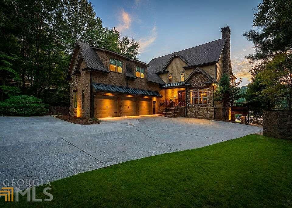 This Gorgeous custom built home on beautiful Lake Arrowhead sits on one of the few level Lake lots that is step-less to your two covered boat slips and docks. One of the covered slips has a hydraulic boat lift. The other dock has a convenient swim ladder. Enjoy the crystal clear 540 acre lake and resort style living with fishing, swimming, boating, skiing, tubing, wake boarding, kayaking and paddle boarding. After a fun day on the lake, entertain your family by the lake side firepit area with lighted masonry seat wall. The home is designed for relaxation and entertaining. As you enter the natural stone and brick entry, the sparkle of the lake is visible through the 3 solid glass windows and the open concept of the kitchen and stairway. The main level features one of the master bedrooms with brick accents, vaulted beamed ceiling and it opens up to its own private vaulted deck. The main deck offers entertainment with the outdoor kitchen, outdoor tv, and built in Hot Springs Hot tub. You can go straight from hot tub to the master suite in the main deck! The upstairs features two bedrooms and an additional master suite with a vaulted beamed ceiling and vaulted deck with incredible views of the lake. An oversized bonus room has a walk in closet and can be used for a variety of functions. The lake level also has the lake view windows, wet bar area with ice maker and bar fridge for entertaining on the large patio. The paver patio has a stone buffet table, outdoor fridge and outdoor TV. The bedroom on this level opens up to a covered patio with a natural stone outdoor gas log fireplace. The flex area is located at the bottom of the stairway. The full size signature American Elevator accesses all three levels and is wheelchair accessible. Lake Arrowhead has a marina , two swimming pools, playground , hiking trails, and one of the best golf courses and country clubs in Ga. Living in this home at Lake Arrowhead is like being on vacation everyday!