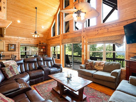 Tucked above Bryson City in the sought-after Fox Run Ridge community, this log cabin feels like a private retreat with unmatched views of the Great Smoky Mountains. On the market for the first time, it offers a rare blend of natural beauty, rustic design, and peaceful surroundings. The covered wraparound porch invites slow mornings and quiet evenings, all set to a backdrop of long-range mountain views. Inside, a wall of windows rises to vaulted ceilings, filling the open floor plan with light. Wood-covered walls and hardwood floors add warmth, while the kitchen features a breakfast bar and dedicated dining area that make entertaining easy. Upstairs, a cozy loft provides flexible space for guests, work, or play. The primary suite includes its own private balcony with panoramic views, creating a restful space to begin and end the day. Located close to the Great Smoky Mountains National Park, Fontana Lake, the Nantahala River, and the scenic railway, this home puts adventure within easy reach. Local shopping and schools are nearby, yet the setting remains quiet and serene thanks to the protective covenants of the Fox Run Ridge community.